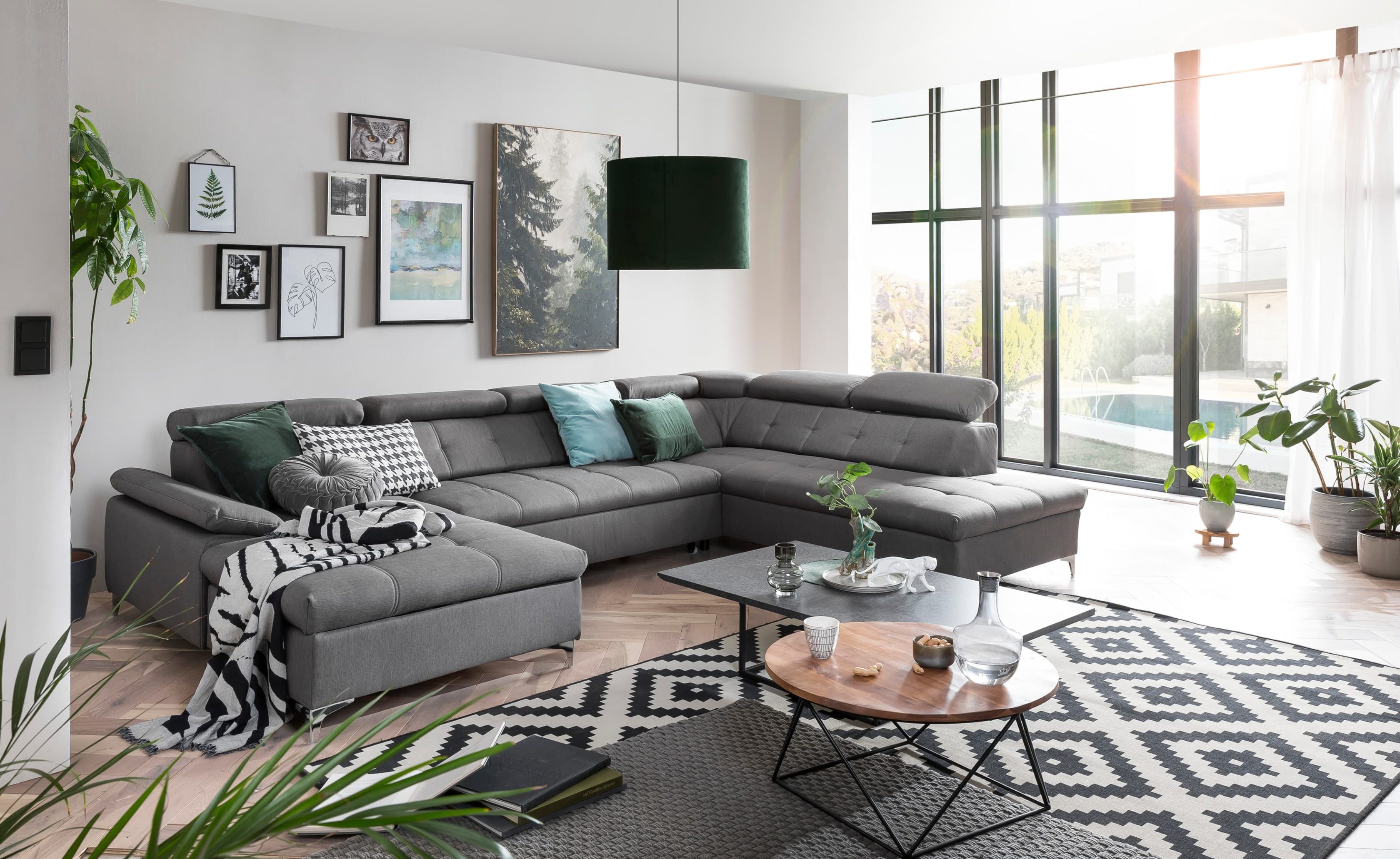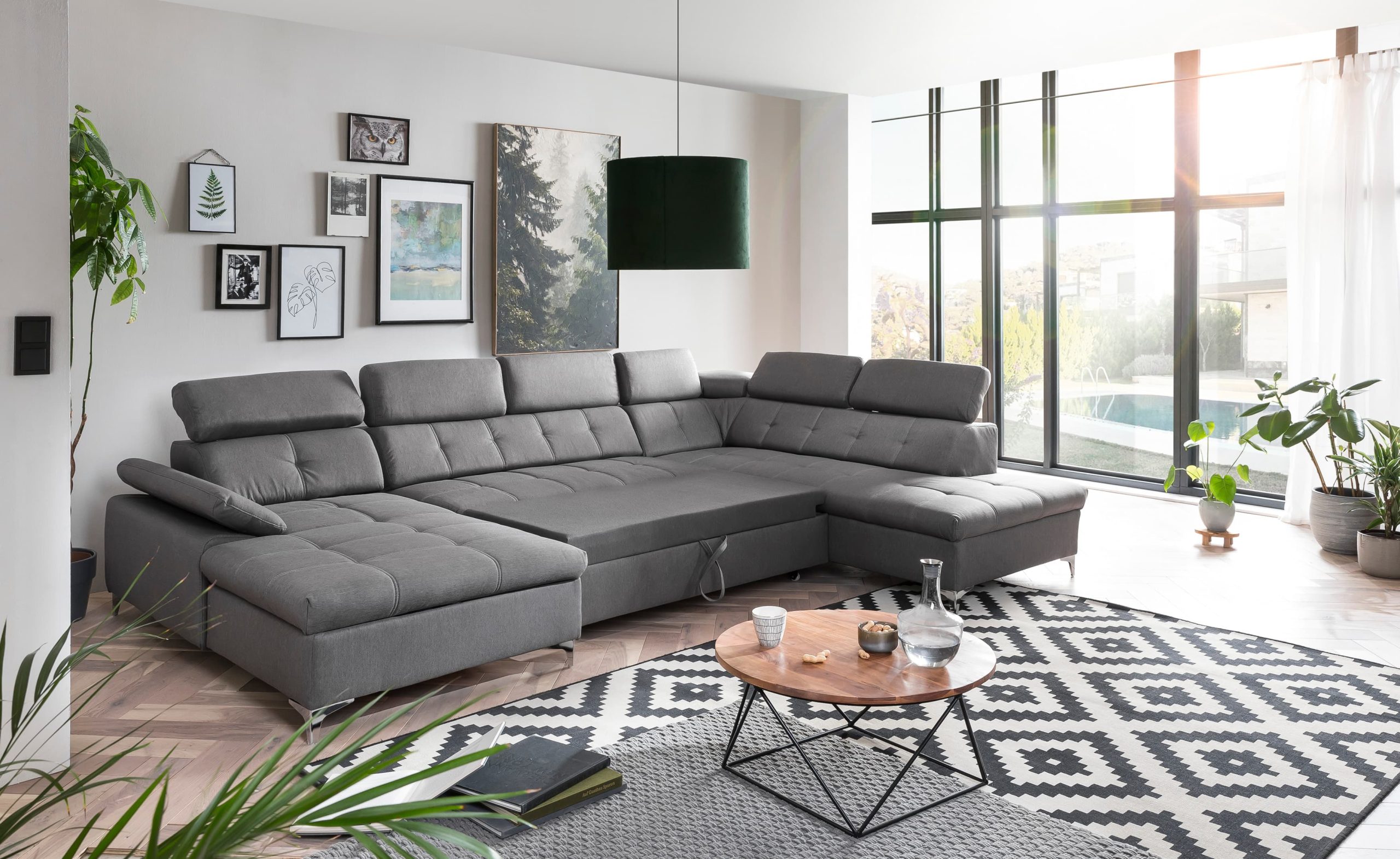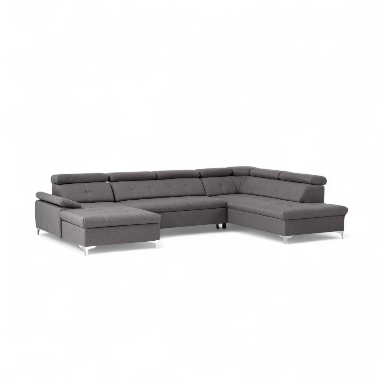 U-formad bäddsoffa SATURN Gomez be Clean 10 är ett smart val för den som vill maximera både sittutrymme och funktion. Den är klädd i ett slitstarkt och mjukt vävt tyg som ger en robust, men varm och inbjudande känsla. När du vill ha gäster är den en generös 4-sitssoffa med mjuka, justerbara nackstöd som låter dig hitta den perfekta avslappningsställningen. Vågfjäderbasen ger stadigt stöd till både rygg och kropp. När det är dags för natten gör du en snabb förvandling: soffan blir till en bekväm dubbelsäng. Under sitsen döljer sig dessutom rymliga förvaring – perfekt för att få undan sänglinne och täcken, så allt hålls snyggt och prydligt.